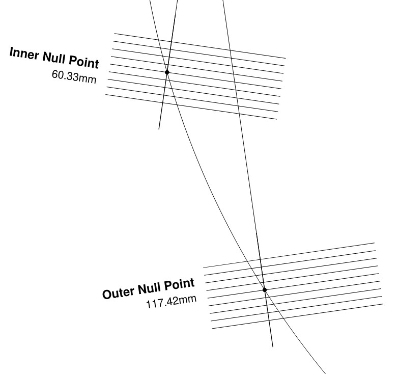O script calcula os pontos nulos ideais (onde o erro de rastreamento = 0) com base na geometria do seu braço e no método de alinhamento escolhido. Ele gera um PDF com um arco correspondente ao caminho da agulha e grades de alinhamento posicionadas nos pontos nulos. Pontos nulos personalizados podem ser especificados para alinhamentos experimentais ou geometrias não padrão.